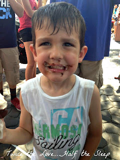 Our next stop was Frontierland. We went to the Country Bear Jamboree, which is Kevin's favorite attraction in Magic Kingdom, dare I say all of Disney. After the show the kids had an ice cream break. Aaron had a Mickey bar and by the looks of it, it was delicious.